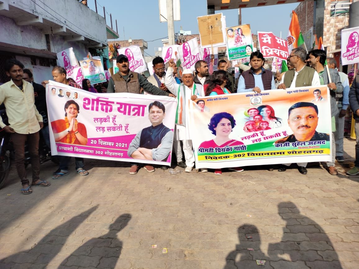 शोहरतगढ़ सिद्धार्थ नगर शोहरतगढ़ विधानसभा में सोमवार 20 दिसंबर को प्रदेश नेतृत्व के आह्वान पर लड़की हूं, लड़ सकती हूं अभियान के तहत महिला शक्ति यात्रा कार्यक्रम चलाया गया । इस यात्रा में विधानसभा क्षेत्र के पार्टी  पदाधिकारियों ने संगठित होकर कार्यक्रम को बेहतर बनाते हुए भव्य यात्रा निकाली । यात्रा के दौरान शोहरतगढ़ विधानसभा भावी प्रत्याशी डॉ सरफ़राज़ ने कहा कि कांग्रेस जो कहती है वो करती है प्रियंका दीदी ने जो वादा किया था महिला शशक्तिकरण को लेकर वह उन्होंने इसी विधानसभा चुनाव 2022 में महिलाओं को आरक्षण देकर महिलाओं का स्वाभिमान और शासन में उनकी भागीदारी सुनिश्चित करने का काम किया है। यही नहीं सरकार बनने पर प्रियंका जी सरकारी नौकरियों में भी आरक्षण लागू करेंगी |शोहरतगढ़ ब्लॉक अध्यक्ष इकबाल नेता ने बताया कि प्रदेश नेतृत्व के आह्वान पर आज शोहरतगढ़ में लड़की हूँ लड़ सकती हूँ अभियान के तहत महिला शक्ति यात्रा कार्यक्रम चल रहा है।उन्होंने बताया कि कार्यक्रम के तहत विधानसभा शोहरतगढ़ में गड़ाकुल स्थित छात्र संघ चौराहे से नगर पंचायत , गोलघर , आर्यनगर , शास्त्री नगर  से होते हुवे नीबी दोहनी स्थित बुधई स्मारक पर पहुँच कर समापन किया गया। उन्होंने कहा कि कार्यक्रम की तैयारी कर सभी नेता व पदाधिकारियों ने कार्यक्रम को सफल बनाने के लिए जिम्मेदारी का कर्मठता और मेहनत के साथ उन्होंने यात्रा को सफल बनाया  है। इसके लिए सभी को धन्यवाद देता हूँ |यात्रा के दौरान रंजना मिश्रा ,  नादिर सलाम ,  इंजीनयर लक्ष्मी यादव ,  अतहर अलीम ,  इकबाल नेता , वाजिद खान ,  नफीस चौधरी , सादिक अहमद शेख ,  वली खान , आलम रायनी , सुड्डू चौधरी , ज़फर खान , शमशेर खान , आकाश उपाध्याय , गुड्डू उपाध्याय , मासूम आदि के साथ सैकड़ों की संख्या में महिला कार्यकर्ता उपस्थित रहीं।