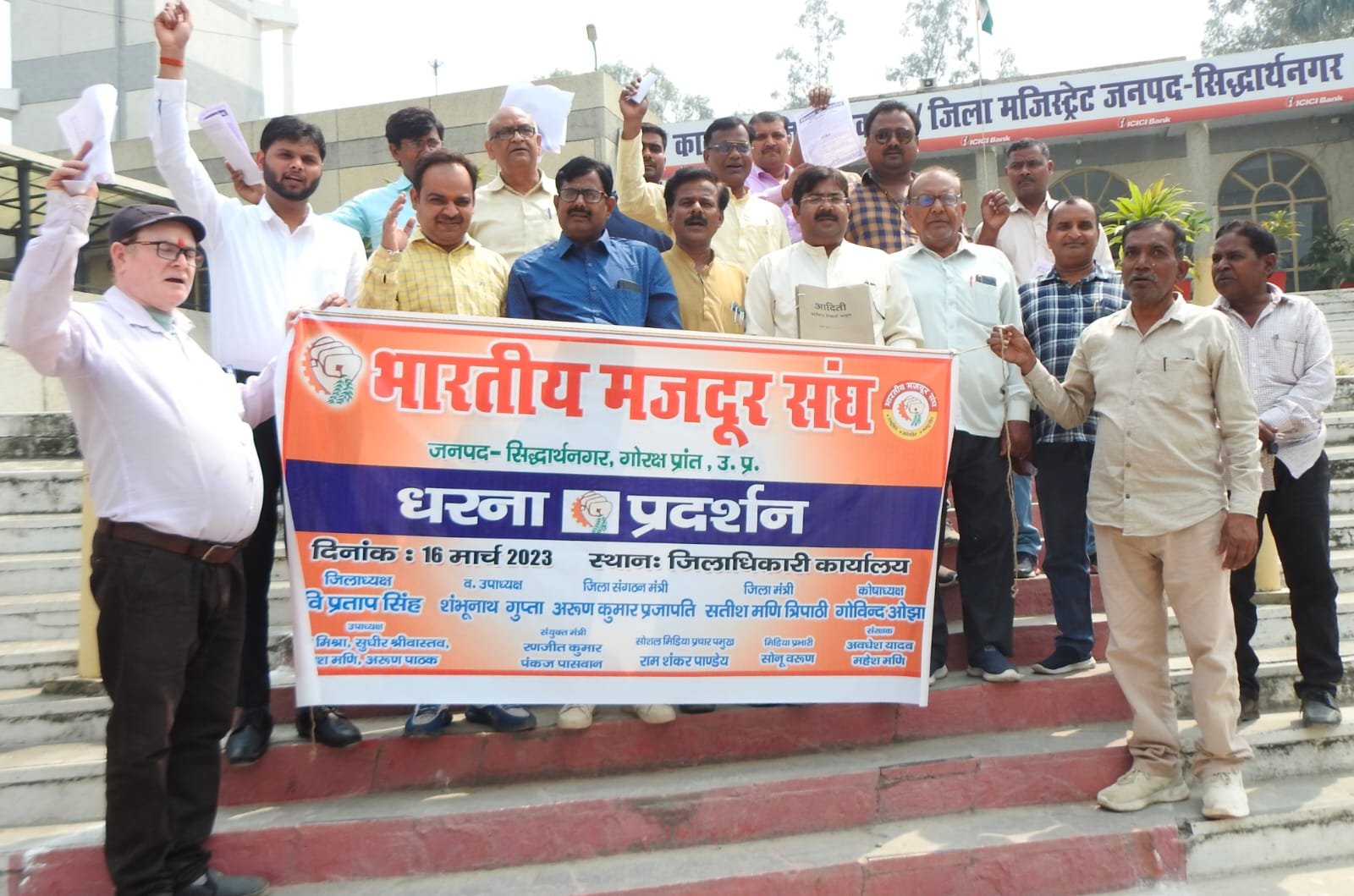 आज जनपद सिद्धार्थनगर में भारतीय मजदूर संघ सिद्धार्थनगर के बैनर तले जिलाधिकारी सिद्धार्थनगर के माध्यम से माननीय मुख्यमंत्री को उत्तर प्रदेश की प्रदेश कार्यसमिति के आवाहन पर संगठित व असंगठित क्षेत्रों के भिन्न-भिन्न उद्योगों में काम करने वाले संविदा / आउटसोर्सिंग / निविदा कर्मचारियों के हो रहे घोर शोषण, उत्पीडन के विरुद्ध प्रदेश के सम्पूर्ण जिलों में आज जिला मुख्यालयों पर भारतीय मजदूर संघ द्वारा विशाल प्रदर्शन करके कर्मचारियों की समस्याओं से सम्बन्धित ज्ञापन प्रेषित किये गये हैं। ज्ञापन में उल्लेखित मॉर्गे निम्न प्रमुख माँगें इस प्रकार से है।