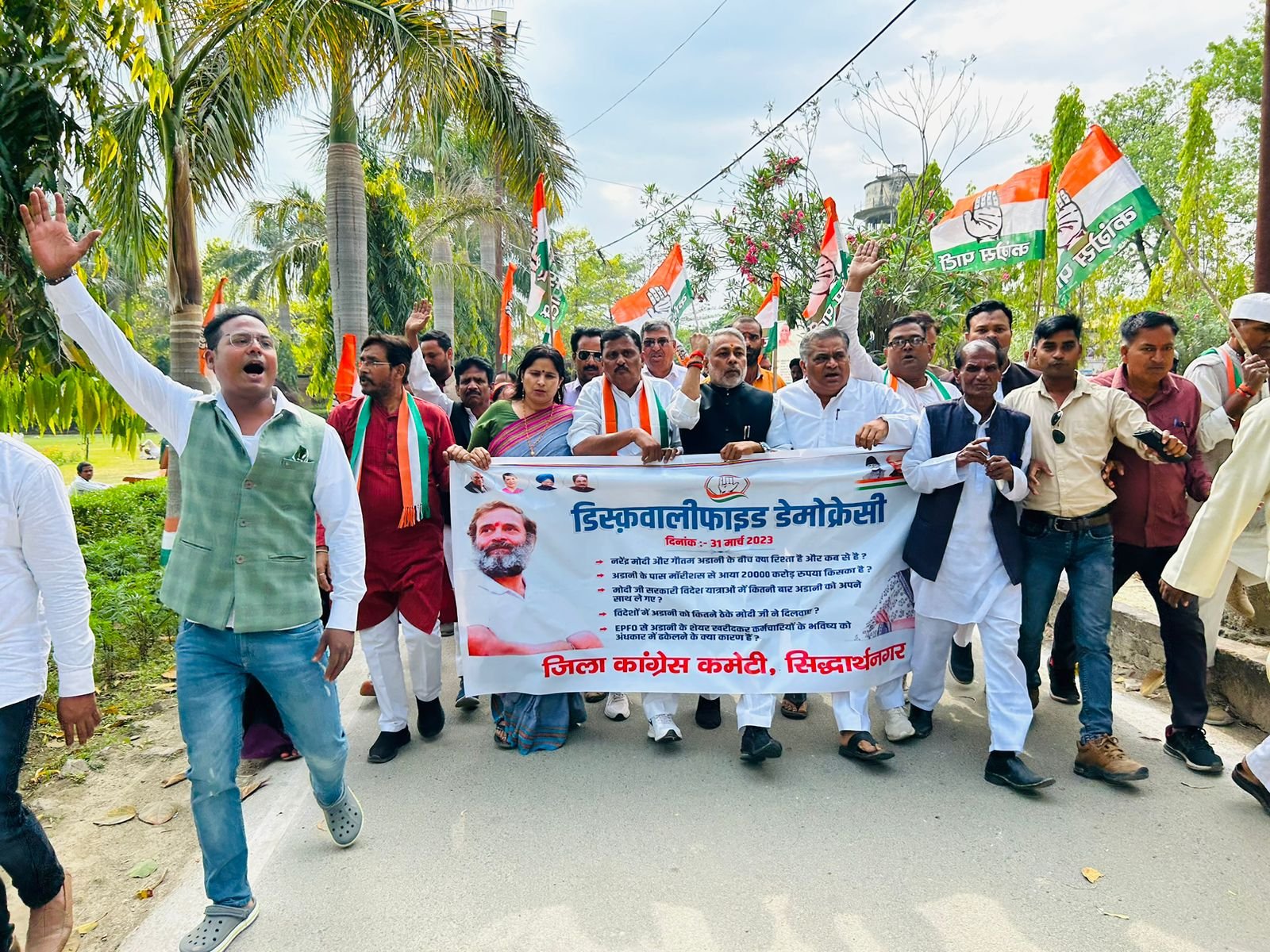 सिद्धार्थ नगर 31 मार्च / कांग्रेस पार्टी के राष्ट्रीय अध्यक्ष एवं पूर्व सांसद राहुल गांधी जी द्वारा लोकसभा में अडानी प्रकरण पर पूछे गए प्रश्नों का उत्तर पाने के लिए आज कांग्रेस कार्यकर्ताओं ने जिला अध्यक्ष काजी सुहेल अहमद की अगुवाई में जिलाधिकारी कार्यालय पर प्रदर्शन कर महामहिम राष्ट्रपति को संबोधित ज्ञापन अति उप जिलाधिकारी को सौंपा।