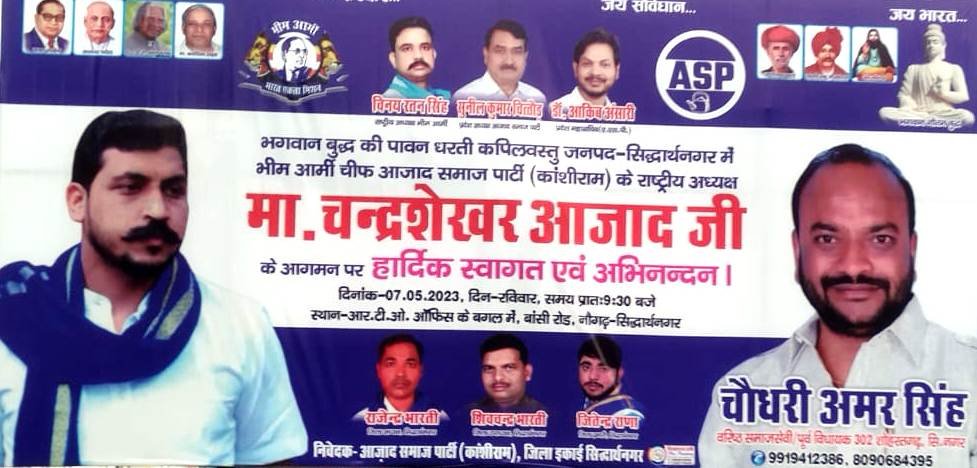 सिद्धार्थनगर । गौत बुद्ध की पावन धरती कपिलवस्तु जनपद सिद्धर्थनगर के आरटीओ दफ्तर के बगल मे रविवार को भीम आर्मी चीफ आजाद समाज पार्टी ( कांशीराम ) के राष्ट्रीय अध्यक्ष चंद्र शेखर आजाद का आगम सुबह समय लगभग 9 बजे होगा ।