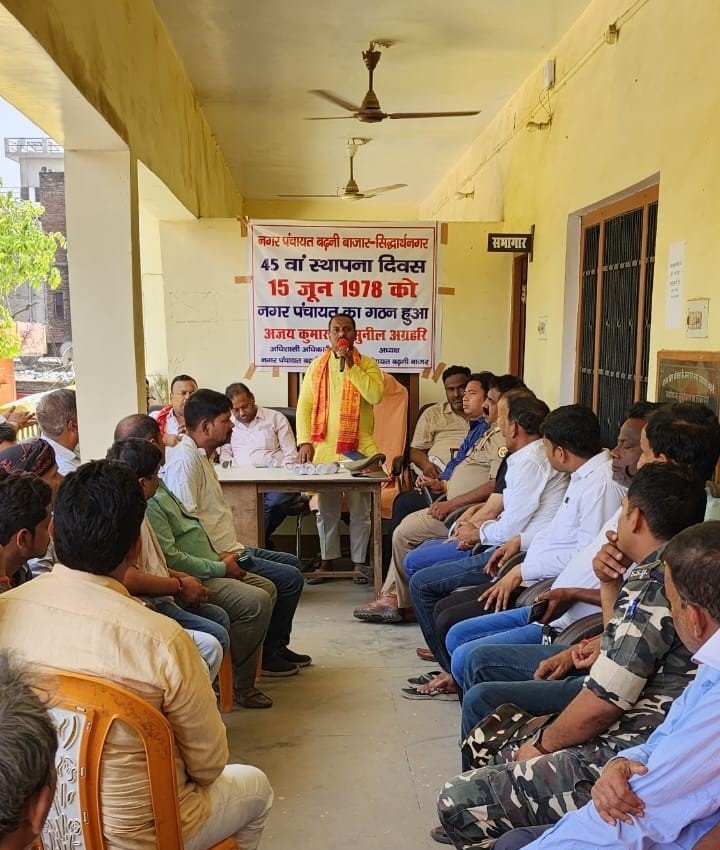 बढ़नी सिद्धार्थ नगर। नगर पंचायत बढ़नी के 45 वा स्थापना दिवस पहली बार नगर पंचायत कार्यालय के प्रांगण में चेयरमैन सुनील अग्रहरि की अध्यक्षता में बड़े ही हर्षोल्लास के साथ मनाया गया , इस दौरान नगर के प्रथम चैयरमैन रहे स्व कैलाश नाथ केडिया का चित्र सभागार में लगाकर श्रद्धांजलि अर्पित की और उनके पग चिन्हों पर चलने का संकल्प लिया। गुरुवार को आयोजित नगर पंचायत के 45वें स्थापना दिवस पर आयोजित कार्यक्रम को संबोधित करते हुए चेयरमैन सुनील अग्रहरि ने कहा कि 15 जून 1978 को नगर पंचायत की स्थापना हुई थीं लेकिन पूर्व के कार्यकाल में नेतृत्व करने वाले किसी नगर अध्यक्ष ने कभी स्थापना दिवस नहीं मनाया और न तो नगर के प्रथम चैयरमैन रहे स्व कैलाश नाथ केडिया को नगर पंचायत कार्यालय में स्मृतियों में रखा। कहा कि आज इस 45वें स्थापना दिवस पर नगर पंचायत के संस्थापक चेयरमैन रहे श्री केडिया का सभागार में चित्र लगाकर उनके पग चिन्हों पर सदैव चलते रहने का संकल्प लेता हूं। नगर को स्वच्छ और सुंदर बनाने के साथ ही शुद्ध पेयजल उपलब्ध कराना मेरी नैतिक जिम्मेदारी है। कार्यक्रम को संबोधित करते हुए विशिष्ट अतिथि खुनियांव प्रधान संघ ब्लॉक अध्यक्ष राजीव सिंह ने उपस्थित जनों को संबोधित करते हुए सभी को एक साथ मिलकर नगर के विकास में सहयोग करने की अपील की। कार्यक्रम को संबोधित करते हुए वरिष्ठ सभासद सतीश शर्मा ने प्रथम चैयरमैन रहे कैलाश नाथ केडिया को श्रद्धांजलि अर्पित करने के उपरांत कहा कि श्री केडिया समाज में विशिष्ट स्थान रखने के अलावा नगर और क्षेत्र के लोगों के दिलों में बसते थे , हम उनके जीवन के आदर्शों , नैतिक मूल्यों का अनुसरण करते हुए उनके पग चिन्हों पर चलने का संकल्प लेते हैं। इस दौरान अधिशासी अधिकारी अजय कुमार ने आए हुए सभी अतिथियों के प्रति आभार ज्ञापित किया। उक्त कार्यक्रम में मुख्य रूप से प्रदीप केडिया , चौकी प्रभारी सभाशंकर यादव , सभासद कन्हैयालाल मित्तल , मो अकबर रजीउद्दीन , निसार अहमद , मो अख्तर , मनोज पाण्डेय, विष्णु अग्रहरि, कन्हैया लाल मित्तल , मनोज पाण्डेय , विष्णु अग्रहरि , श्री राम , मनोज यादव , मो अहमद , कंप्यूटर ऑपरेटर ऋषभ मोदनवाल , मुन्नू मौर्य , पूर्व सभासद संजय जयसवाल , ब्रजेश अग्रहरि , रामराज कन्नौजिया, सचिन मित्तल आदि मौजूद रहे।