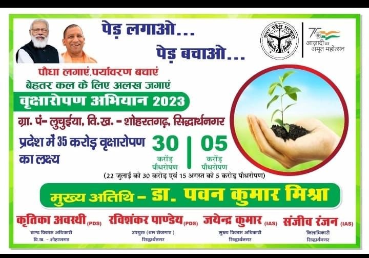 प्रदेश के मुख्यमंत्री योगी आदित्यनाथ के निर्देश पर आज उत्तर प्रदेश में वृहद वृक्षारोपण कार्यक्रम का शुभारंभ हुआ है। जिसमें आज 30 करोड़ पौधारोपण पूरे प्रदेश में किया जाना है।