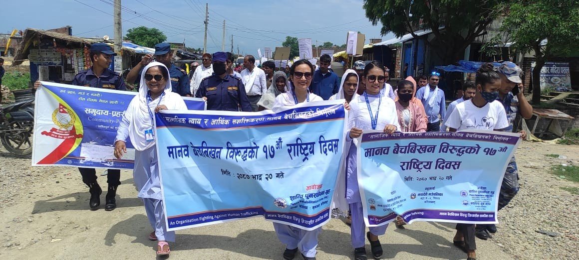 सिद्धार्थनगर। नेपाल के 17वा राष्ट्रीय मानव तस्करी रोक थाम दिवस के अवसर पर बुद्धवार को भारतीय सीमा से सटे पड़ोसी राष्ट्र नेपाल के चाकरचौड़ा में पीआरसी एव स्वतन्त्र युवा क्लब द्वारा सन साइन सामाजिक संस्था के सहयोग से मानव तस्करी के विरूद्ध जन जागरूकता रैली तथा गोष्ठी का आयोजन किया गया।