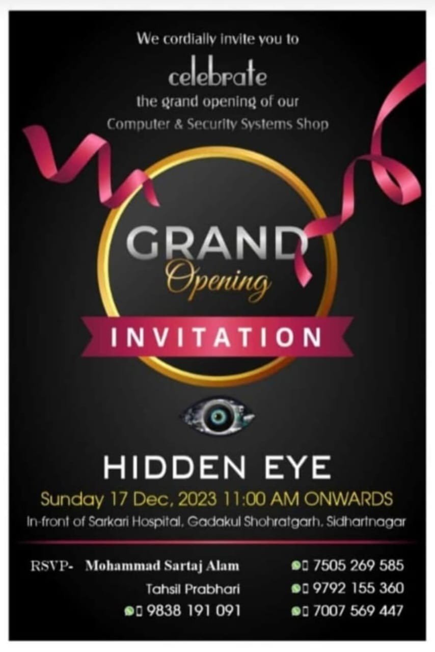 शोहरतगढ़/सिद्धार्थनगर। नगर पंचायत शोहरतगढ़़ के सामुदायिक स्वास्थ्य केन्द्र शोहरतगढ़़ के सामने हिडेन आई सिक्योरिटी सिस्टम का उदघाटन बतौर मुख्य अतिथि विधायक शोहरतगढ़़ विनय वर्मा एवं विशिष्ट अतिथि सांसद प्रतिनिधि सूर्य प्रकाश पाण्डेय उर्फ पहलवान रविवार को 12.00 बजे उदघाटन करेंगे। वरिष्ठ पत्रकार सरताज आलम ने सभी हित मित्र, मीडियाकर्मी एवं कस्बावासियों से अपील की है कि हिडेन आई के उदघाटन के अवसर पर सभी लोग उपस्थित होकर कार्यक्रम को सफल बनाएं।