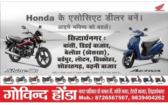 गोविन्द हौंडा सिद्धार्थ नगर के मार्केटिंग हेड द्वारा बताया गया कि सिद्धार्थ नगर के बांसी , डीडई बाज़ार , बेलौहा [ खेसरहा ] बर्डपुर , लोटन ,बिस्कोहर , शोहरतगढ़ और बढ़नी बाज़ार से इच्छुक लोगों से आवेदन मांगे गए गए है |