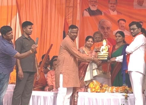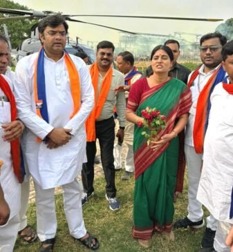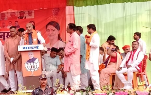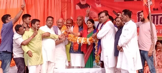 जनसभा को संबोधित करती केंद्रीय मंत्री व अन्य।