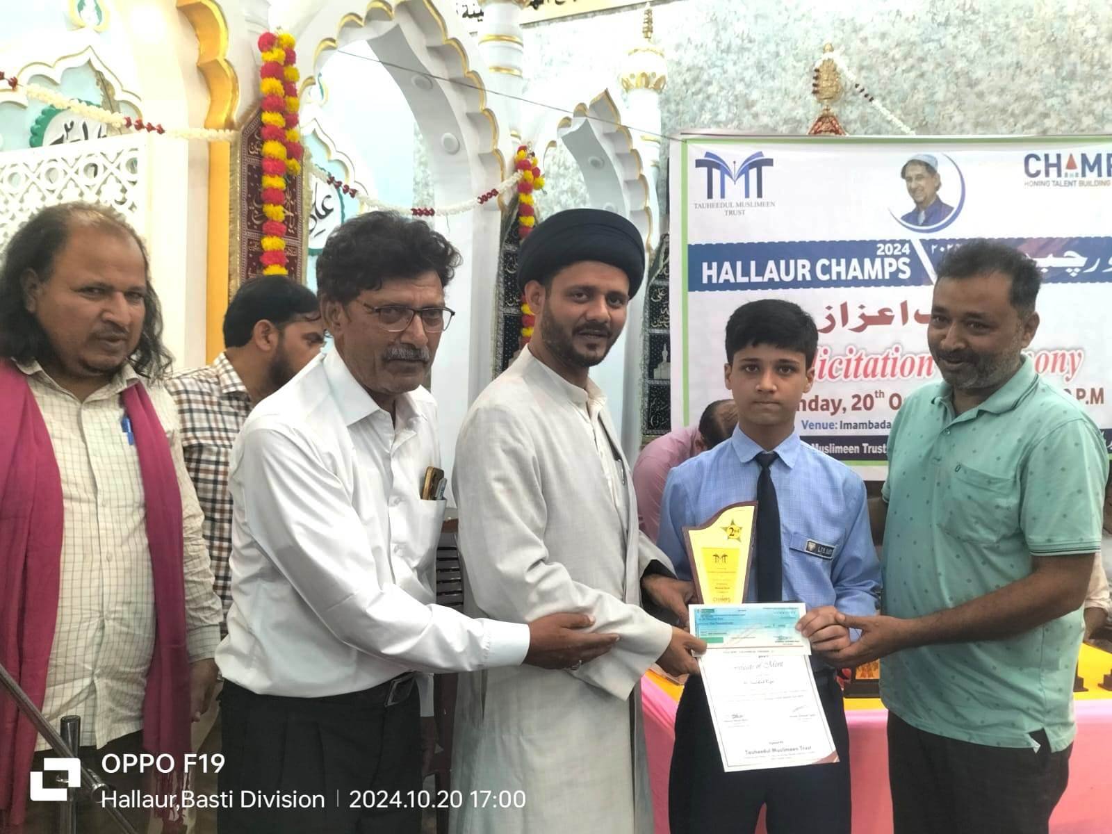 इस दौरान हल्लौर के कक्षा6-7 की कैटेगरी में उत्तर प्रदेश में दूसरी रैंक लाने वाले अली नौशाद रिजवी प्रशस्ति पत्र एवं स्मृति चिन्ह के माध्यम से सम्मानित किया गया साथियों ने पांच हज़ार का नगद पुरस्कार भी दिया गया।