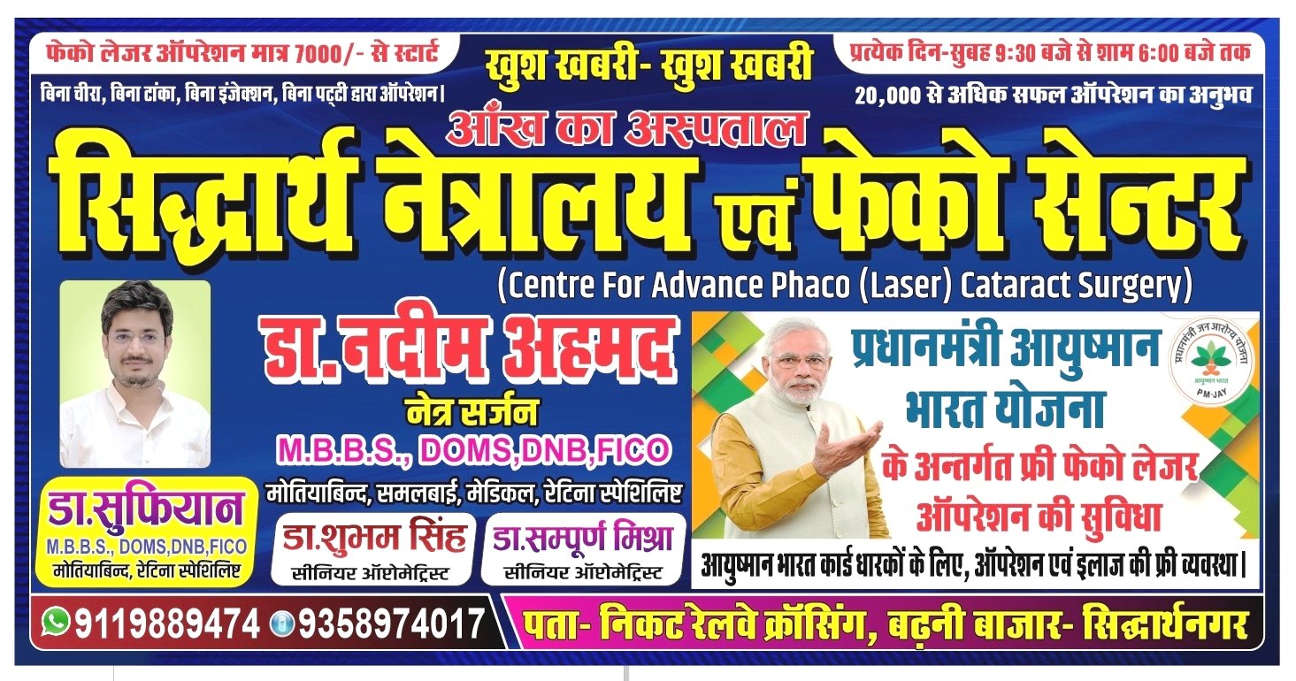 बढ़नी क़स्बा स्थित सिद्धार्थ नेत्रालय [ आँख का अस्पताल ] में अब आयुष्मान भारत योजना के तहत मरीजों को मुफ्त इलाज और ऑपरेशन की सुविधा मिलेगी। यह पहल गरीब और जरूरतमंद लोगों के लिए एक बड़ी राहत साबित होगी, जो इलाज का खर्च उठाने में असमर्थ होते हैं।
