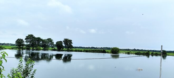 बाढ़ के कारण सैकड़ों एकड़ फसलें पानी में डूब गई हैं, जिससे किसानों की चिंता बढ़ गई है। स्थानीय प्रशासन स्थिति पर नजर बनाए हुए है।