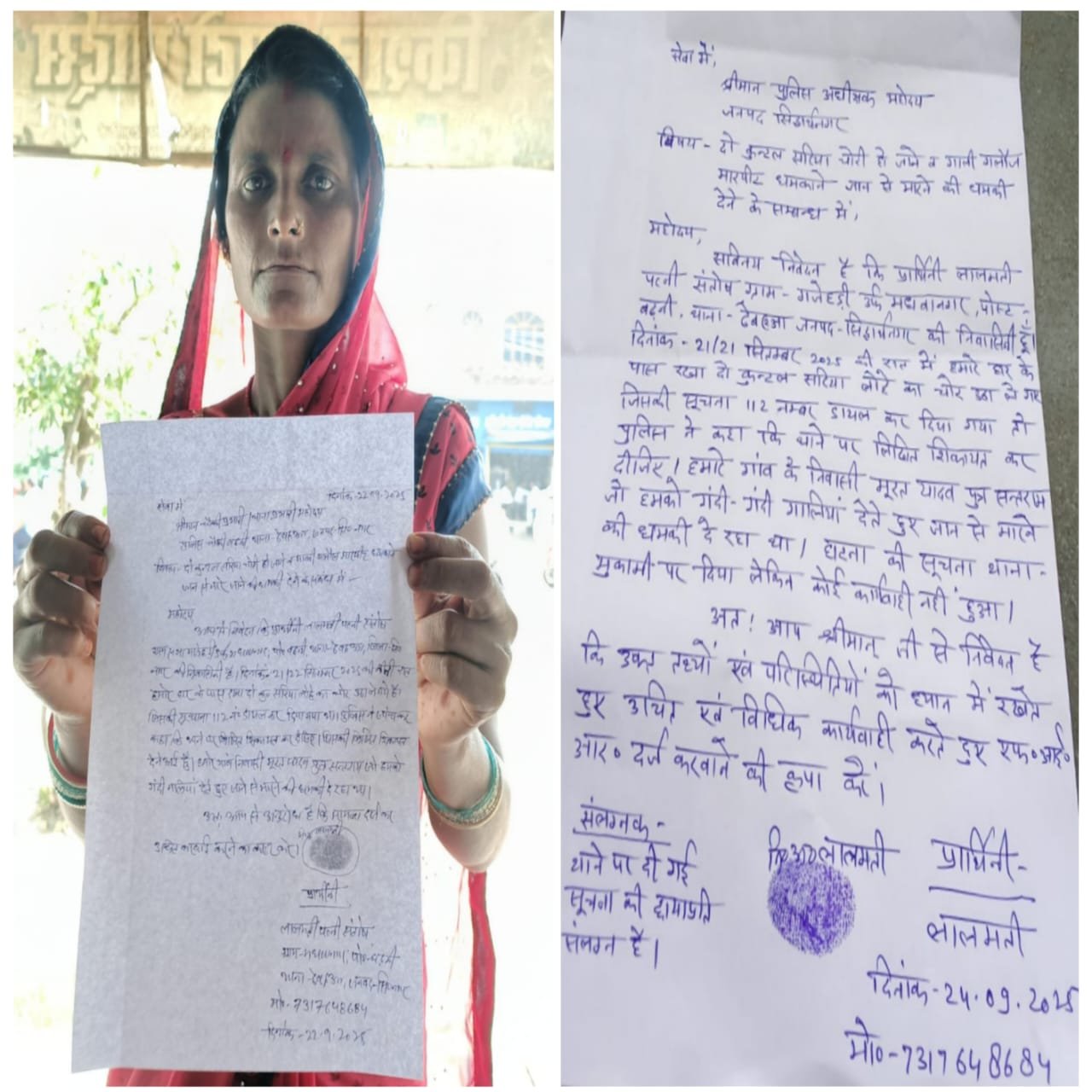 महिला का कहना है कि वह अपना मकान बनवा रही थी। जिसके निर्माण के लिए लगभग दो कुंटल लोहे की सरिया छत की ढलाई के लिए खरीद कर घर के पास रखी हुई थी, जिसे 22 सितंबर की बीती रात चोर उठा ले गये । जिसकी सूचना 112 नम्बर डायल कर दिया तो मौके पर पहुंची पुलिस ने कहा कि चौकी थाने पर जाकर लिखित शिकायत करो। महिला ने बताया कि खोज बीन के दौरान गांव निवासी मूरत यादव पुत्र सन्तराम जो हमको गंदी-गंदी गालियां देते हुए जान से मारने की धमकी दे रहा था।