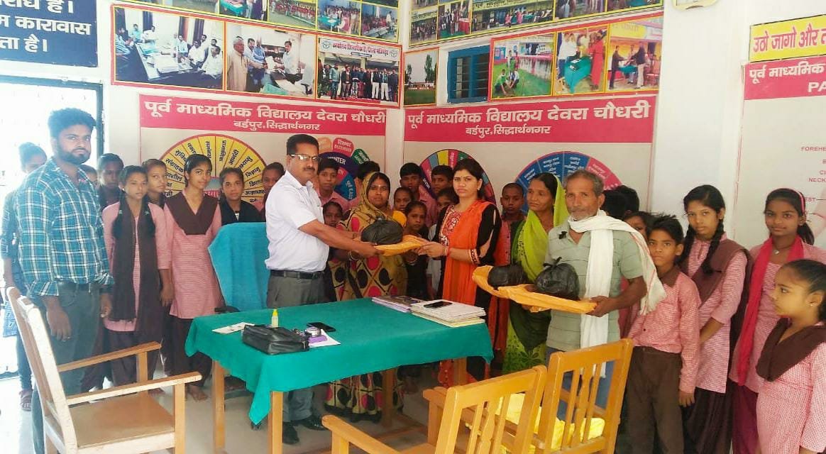 सिद्धार्थनगर 30 अप्रैल। विकास क्षेत्र बर्डपुर के पूर्व माध्यमिक विद्यालय देवरा चौधरी में ईद के त्यौहार को देखते हुए विद्यालय में सबसे कम मानदेय पर कार्यरत सभी रसोइयों को बतौर ईदी अंगवस्त्र और विशेष पकवान हेतु सामग्री का पैकेट भेंट किया गया। सभी रसोइया ने ईद की ईदी पाकर खुशी का इज़हार किया।