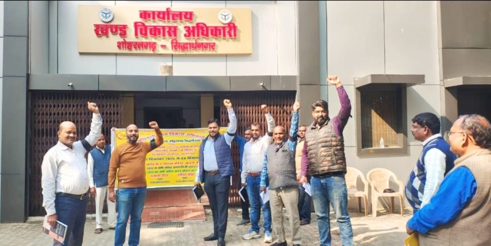 विकास खण्ड शोहरतगढ़़ पर ग्राम पंचायत अधिकारी/ग्राम विकास अधिकारी समन्वय समिति के बैनर तले सभी सचिवों ने ऑनलाइन उपस्थिति (एफआरएस) एवं सचिवों से लिए जा रहे गैर विभागीय कार्यों के विरोध में मंगलवार को शान्तिपूर्ण विरोध प्रदर्शन किया है। वरिष्ठ सचिव रामस्वरूप गुप्ता की अगुवाई में वरिष्ठ सचिव राम सिंह, प्रभारी एडीओ (पं0) एवं सचिव कुंवर कन्नौजिया, सचिव अजय भारतीया, सचिव कामेश्वर मिश्र, सचिव गौरव श्रीवास्तव, सचिव संदीप सरोज आदि ने हाथ में काली पट्टी बांधकर विरोध दर्ज किया।