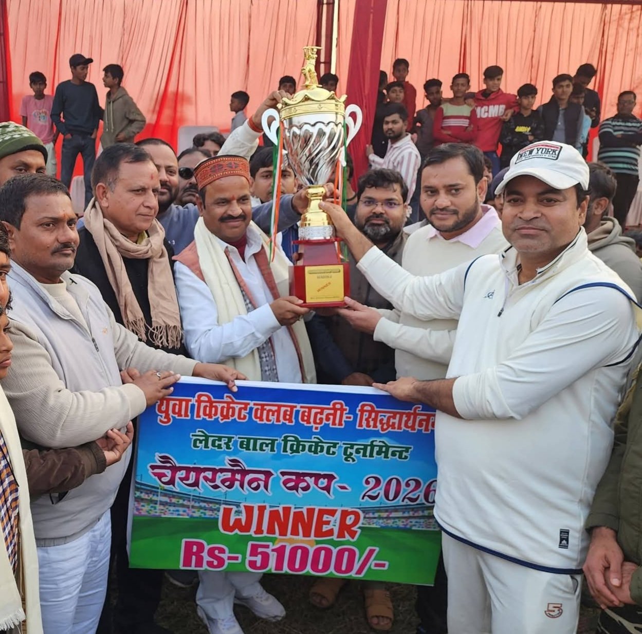 बढ़नी क्षेत्र के घरुवार स्थित मिनी स्टेडियम में आयोजित प्रतिष्ठित लेदर बॉल क्रिकेट टूर्नामेंट ‘चेयरमेंट कप सीजन-2’ के फाइनल मुकाबले में डुमरियागंज की टीम ने अपने शानदार प्रदर्शन से इतिहास रच दिया। फाइनल के रोमांचक मुकाबले में डुमरियागंज ने बलरामपुर की टीम को 70 रनों के बड़े अंतर से हराकर विजेता की ट्रॉफी पर कब्जा जमाया।