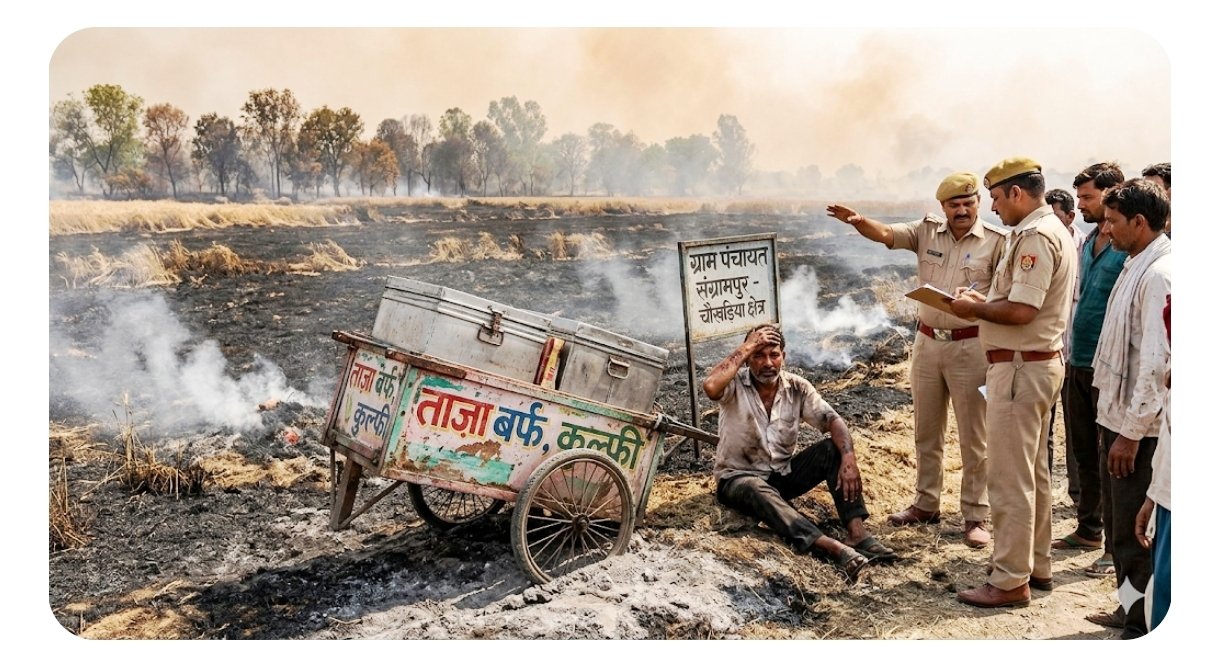 इटवा। क्षेत्र के संग्रामपुर और चौखड़िया गांव के बीच रविवार को गेहूं के डंठलों में लगी भीषण आग ने एक गरीब परिवार की खुशियों को झुलसा दिया। तेज पछुआ हवाओं के साथ काल बनी लपटों ने न केवल खेतों को अपनी चपेट में लिया, बल्कि रोजी-रोटी कमाकर घर लौट रहे एक बर्फ विक्रेता को भी मौत के मुहाने पर खड़ा कर दिया।