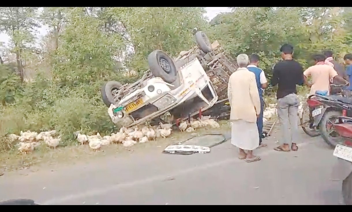 NH-730 पर अनियंत्रित होकर पलटी मुर्गियों से लदी पिकअप, मची अफरा-तफरी