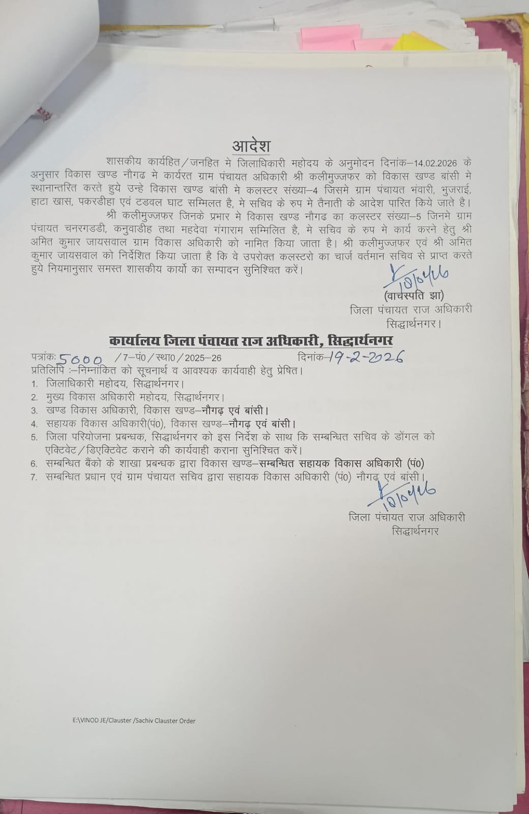 जिला पंचायत राज अधिकारी, सिद्धार्थनगर द्वारा जारी पत्र संख्या **5000/7-पं.अ./स्था.अ./2025-26** (दिनांक 19-02-2026) के अनुसार, विकास खंड नौगढ़ में कार्यरत ग्राम पंचायत अधिकारी **श्री कलीमुज्जफर** का स्थानांतरण विकास खंड बांसी के **क्लस्टर संख्या-4** (जिसमें भवारी, भुजराई, हाटा खास जैसी ग्राम पंचायतें शामिल हैं) में किया गया था।