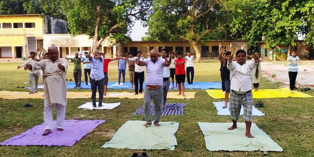 रहे निरोग। का संदेश पूरे विश्व को दिया है। इस कड़ी में स्थानीय कस्बा के किसान इंटर कालेज पर योग प्रशिक्षक वेन्कटेशवर पाण्डेय ने सभी को विभिन्न प्रकार का योग करवाया।