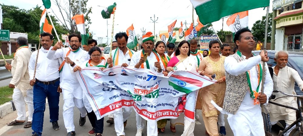 सिद्धार्थ नगर, 15 अगस्त/ स्वतंत्रता आंदोलन एवं देश के महान शहीदों की स्मृति में मंहगाई और बेरोज़गारी के खिलाफ आजादी के 75 वीं वर्षगांठ पर कांग्रेस पार्टी द्वारा 09 अगस्त से चल रही आजादी गौरव पदयात्रा का आज़ कपिलवस्तु विधानसभा में समापन हो गया। आज़ प्रातः 9 बजे जिला कांग्रेस कार्यालय पर ध्वजारोहण के बाद कांग्रेस कार्यकर्ताओं ने जिला अध्यक्ष काजी सुहेल अहमद, पूर्व लोकसभा प्रत्याशी डा• चंद्रेश उपाध्याय एवं पूर्व प्रत्याशी देवेन्द्र कुमार गुड्डू के नेतृत्व में जिला कांग्रेस कार्यालय से पदयात्रा शुरू की जो शहर के मुख्य मार्ग से होते हुए गांधी आश्रम पहुंची और वहां पहुंच कर राष्ट्रपिता महात्मा गांधी जी के प्रतिमा पर माल्यार्पण कर समाप्त कर दी गई।