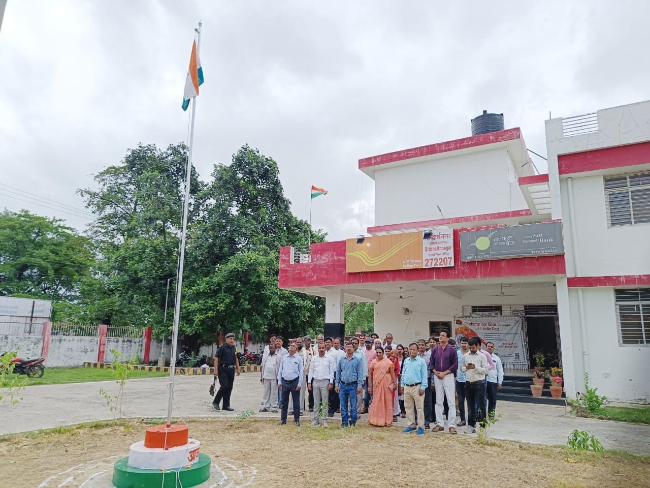 सिद्धार्थनगर । आजादी के 75 वां साल पूरे होने , अमृत महोत्सव एवं हर घर तिरंगा के पावन पर्व पर् जिला मुख्यलय् स्थिति प्रधान डॉक घर सिद्धार्थनगर मे राष्ट्रीय ध्वजारोहण कार्यक्रम अधीक्षक डाकघर बस्ती रविन्द्र् प्रताप गिरी के कुशल निर्देशन एवं पोस्ट मास्टर प्रधान डाकघर सिद्धार्थनगर अब्दुर रहमान खान की उपस्थति बड़े ही हर्षौलास् के साथ संपन्न हुआ ।