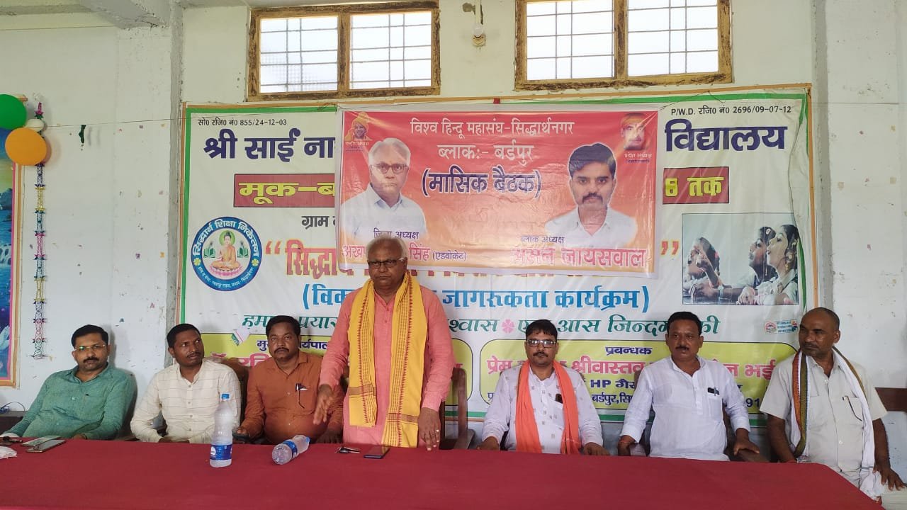 सिविल सिद्धार्थ बार एसोसिएशन के पूर्व अध्यक्ष एव विश्व हिंदू महासंघ के जिला अध्यक्ष अधिवक्ता अखण्ड प्रताप सिंह की अध्यक्षता में बर्डपुर ब्लाक क्षेत्र की मासिक बैठक सम्पन्न हुई। जिसमें सर्वसम्मति से बर्डपुर ब्लाक कार्यकारिणी का गठन किया गया। जिसमे ब्लाक अध्यक्ष अमन जायसवाल, महामंत्री अनिल उमर, वरिष्ठ उपाध्यक्ष दीपक वर्मा, उपाध्यक्ष आकाश शुक्ला एवं सुरेन्द्र गौंड़, संगठन मंत्री राजेश गुप्ता, कोषाध्यक्ष सजंय जायसवाल, मीडिया प्रभारी पुनीत जायसवाल, एव सदस्य विनोद कुमार को बनाया गया है। तथा कपिलवस्तु नगर पंचायत की कार्यकारिणी में राजन मोदनवाल को नगर अध्यक्ष एव विनय वर्मा को महामंत्री मनोनीत किया गया है। इसी क्रम में ककरहवा बाजार की कार्यकारिणी में नगर अध्यक्ष सर्वेश वर्मा, नगर उपाध्यक्ष गिरजेश वर्मा, महामंत्री सुनील मिश्रा को सर्वसम्मति से मनोनीत किया गया है। इसी क्रम में शोहरत गढ़ की जिम्मेदारी राकेश मिश्रा को सौंपी गई है। बैठक में मुख्य रूप से अधिवक्ता प्रकोष्ठ के जिला अध्यक्ष इंदू कुमार सिंह, सुनील त्रिपाठी, अनिल विश्वकर्मा, जितेंद बहादुर सिंह, सुरेंद्र पाण्डेय, जैनेन्द्र मिश्रा, देवेश श्रीवास्तव, ललितेश मिश्रा, जिला पंचायत सदस्य सबलू साहनी, कौशल अग्रहरि, पंकज यादव, विमल पटेल, रूपक चौरसिया, राकेश जायसवाल, जितेंद गुप्ता, वेद प्रकाश शुक्ला, दुर्गेश यादव, राजकुमार यादव, विशाल वर्मा, अर्जुन, अजय शर्मा, प्रदीप कुमार शर्मा, विनोद, मनोज, दुर्गेश, अवधेश, डब्लू, अमित, विजय यादव आदि शामिल रहे। बैठक को सम्बोधित करते हुए जिला अध्यक्ष अधिवक्ता अखण्ड प्रताप सिंह ने कहा कि हिन्दू हितों की रक्षा के लिए, हिन्दुओ के सम्मान के लिए विश्व हिंदू महासंघ का गठन किया जा रहा है। उन्होंने बताया कि आगामी 13 सितम्बर को प्रदेश अध्यक्ष का आगमन जिले में होने जा रहा है। जिसके लिए तैयारियां शुरू कर दी गई है।