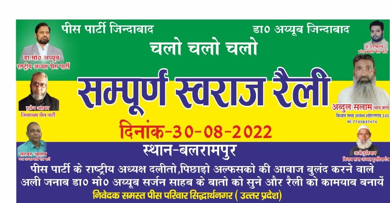 पीस पार्टी द्वारा आयोजित बलरामपुर जनपद में सम्पूर्ण स्वराज रैली के आयोजन को सफल बनाने के लिए विधान सभा वाइज बैठक करते हुवे आने वाले 30 तारीख को पीस पार्टी कार्यकर्ता अपने हौशलों की आजमाइश करेंगे ।बलरामपुर में होने वाली सम्पूर्ण स्वराज रैली में दलितों , पिछड़ों एवम अल्पसंख्यकों के अधिकारों व राजनीति में उनकी सक्रिय भागीदारी को लेकर एक बड़ा माहौल बनाने की कोशिश होगी । इस रैली को पीस पार्टी मुखिया डॉक्टर अयूब अंसारी संबोधित करंगे।