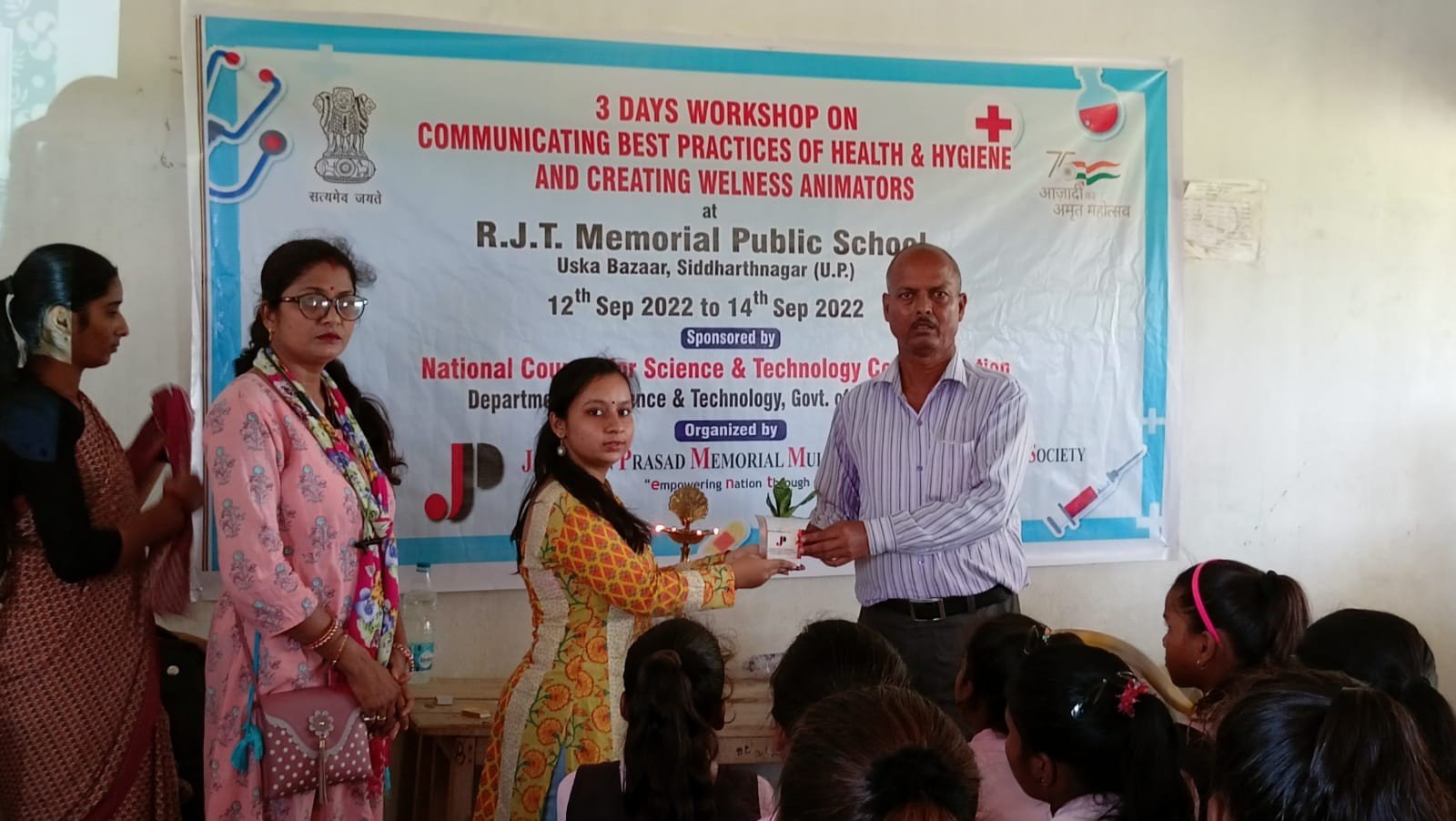 सिद्धार्थनगर। आर जे टी मेमोरियल पब्लिक स्कूल, उसका बाजार, सिद्धार्थनगर में विज्ञान एवं प्रौद्योगिकी विभाग, भारत सरकार द्वारा प्रायोजित तीन दिवसीय स्वास्थ्य एवं स्वच्छता जागरूकता शिविर का समापन बुद्धवार को हुआ। प्रशिक्षण में साफ पेयजल, व्यक्तिगत स्वच्छता, अथवा अपने आस पास की सफाई से जुड़े सवालों और गलतफहमियों को समझाया गया। बच्चों को अपने दिनचर्या में सही आदतों का पालन जिसमे सही तरीके से हाथ धोना मुख्य है, इसको न करने से अनेकों बीमारियाँ पनपती हैं, आदि विषयों के बारे में छात्रों को जागरूक किया गया।