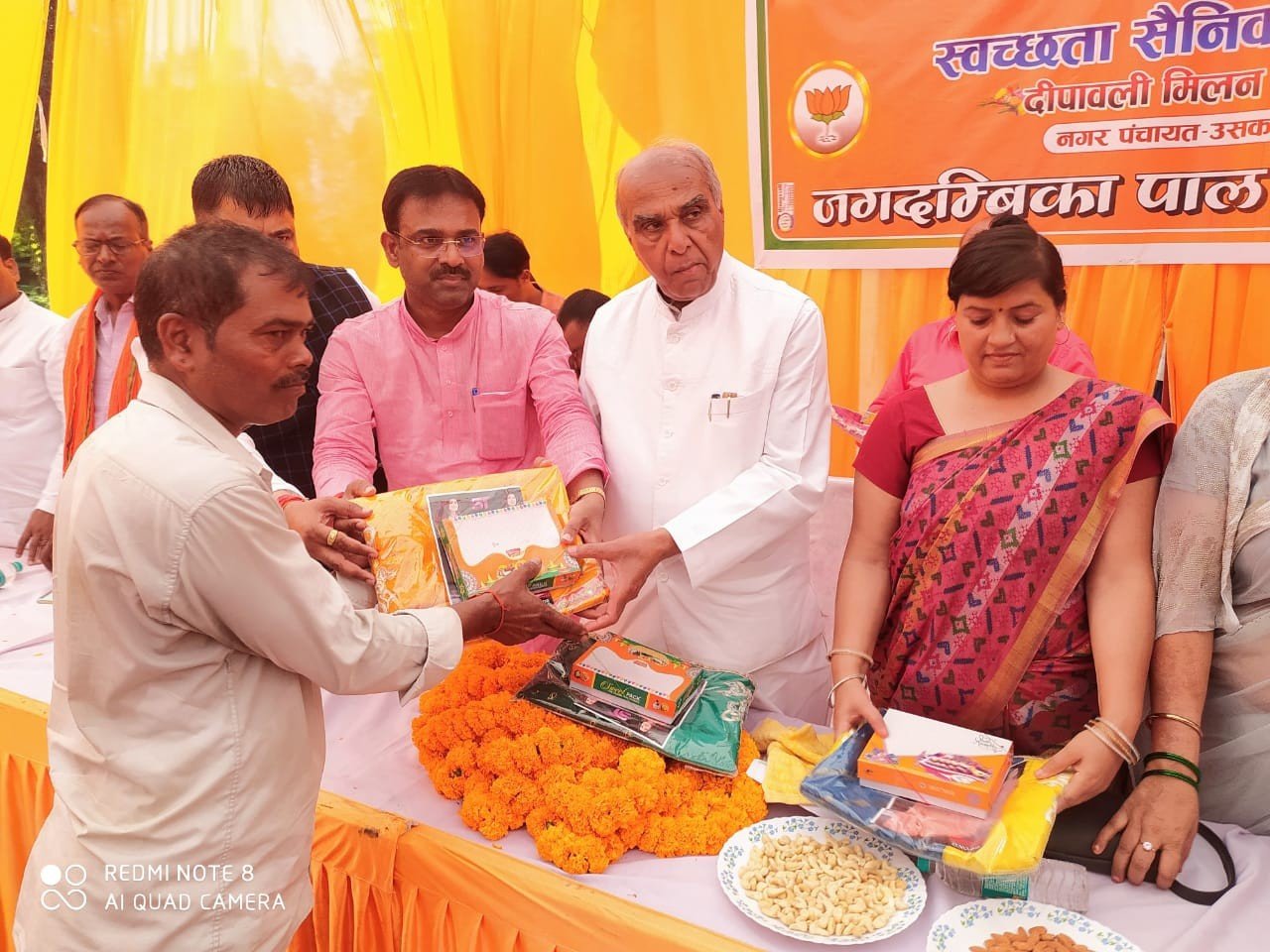 उसका बाजार सिद्धार्थनगर।रविवार को क्षेत्रीय सांसद जगदम्बिका पाल ने स्थानीय नगर के डॉकबँग्ला परिसर में आयोजित ‘दीपावली मिलन समारोह’ में स्वच्छता सैनिकों (कर्मियों) को अंगवस्त्र और मिष्ठान आदि देकर सम्मानित किया।इस मौके पर सांसद जगदंबिका पाल ने स्वच्छता सैनिकों (सफाई कर्मियों) को अंग वस्त्र देते हुए कहा कि स्वच्छता सैनिक (सफाई कर्मी) समाज लिए बेहद महत्वपूर्ण हैं।स्वच्छता सैनिक (सफाई कर्मी) खुद तो कचरा और गन्दगी उठाते हैं और हमें स्वच्छ और स्वस्थ वातावरण सुलभ कराने जिम्मेदारी उठाते हैं।स्वच्छता सैनिकों के मजबूत कन्धे पर देश व समाज के स्वस्थ्य वातावरण की अहम जिम्मेदारी निर्भर है।अतः यह समाज के सबसे महत्वपूर्ण व्यक्ति हैं।सांसद श्री पाल ने स्वच्छता सैनिकों को दीपावली त्यौहार की शुभकामनाएँ ज्ञापित करते हुए मनोयोग से कर्तव्यपथ पर लगकर कार्य करने की प्रेरणा दिया। इस मौके पर सांसद ने नगर पंचायत के कुल लगभग 75 स्वच्छता कर्मियों (स्वच्छता सैनिकों ) को अंग वस्त्र और मिष्ठान देकर दीपावली की बधाई दिया।इस अवसर पर जगदीश जायसवाल, पूर्व चेयरमैन हेमंत जायसवाल, सोमनाथ मिश्र,ओमकार नाथ पांडेय,जय प्रकाश पाण्डेय,जीतेन्द्र पांडेय, रामदरश त्रिपाठी, मुरारी सिंह ,राम भरोस चौहान, सरोज शुक्ला , अनूप सिंह