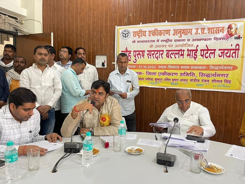 राष्ट्रीय एकीकरण अनुभाग उ०प्र० शासन के तत्वधान में जिला एकीकरण समिति सिद्धार्थनगर द्वारा आज विकास भवन सभाकक्ष में लौह पुरूष सरदार वल्लभ भाई पटेल जी के जन्मदिवस को राष्ट्रीय अखण्डता दिवस’ के रूप में मनाया गया। इस दौरान विधायक विनय वर्मा ने सरदार पटेल जी के चित्र पर माल्यार्पण कर कहा सरदार बल्लभ भाई पटेल के व्यक्तित्व एवं कृतित्व पर चर्चा करते हुवे उनके जीवन पा प्रकाश डाला।