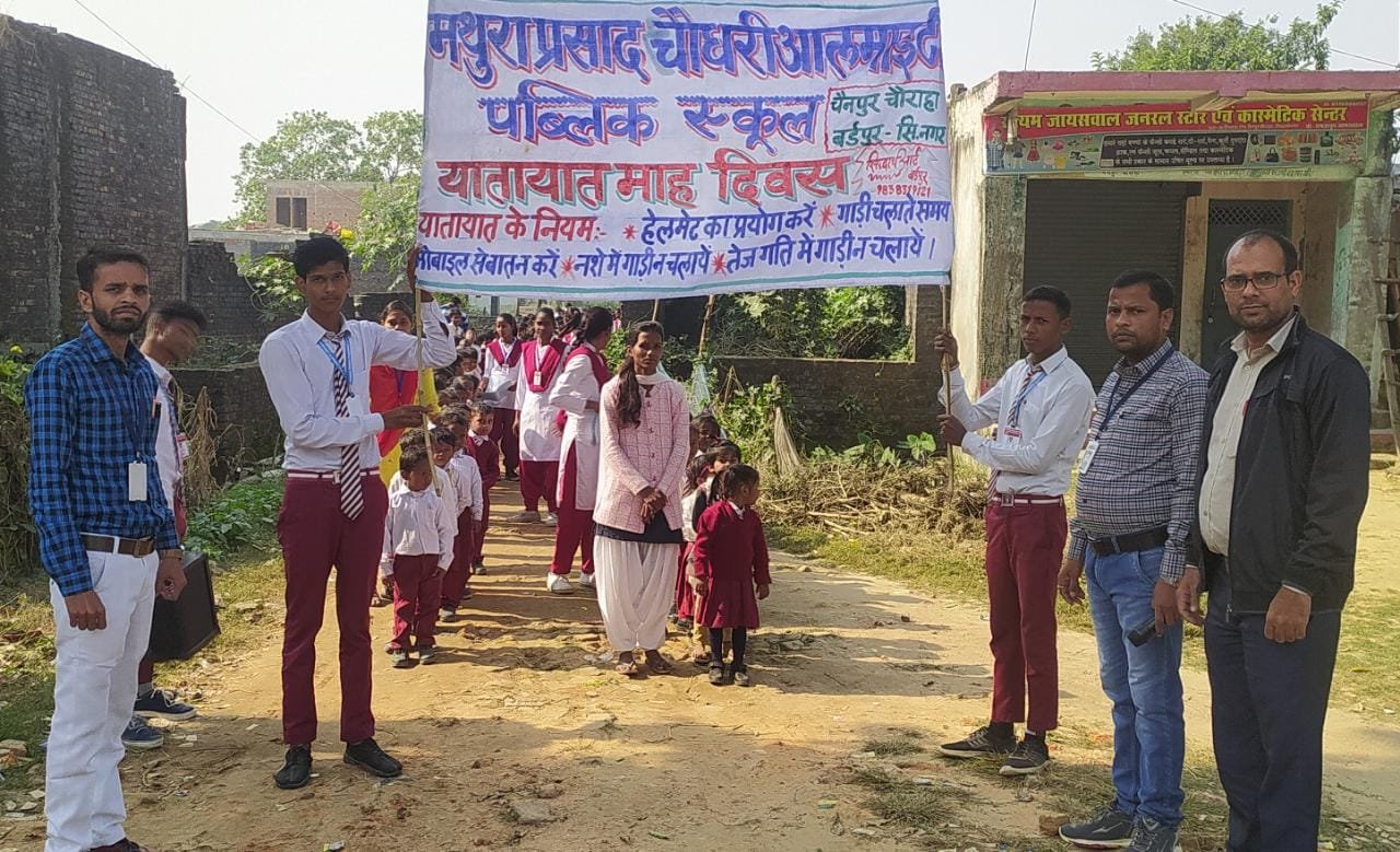 सिद्धार्थनगर ।कपिलवस्तु नगर पंचायत स्थित अटल नगर के हथिहवां में आज मथुरा प्रसाद चौधरी ऑलमाइटी पब्लिक स्कूल के छात्र छात्राओं ने यातायात माह दिवस में रैली निकालकर सड़क पर चलने वाले लोगों को ट्रैफिक नियम एवं सुरक्षा का पाठ पढ़ाया।