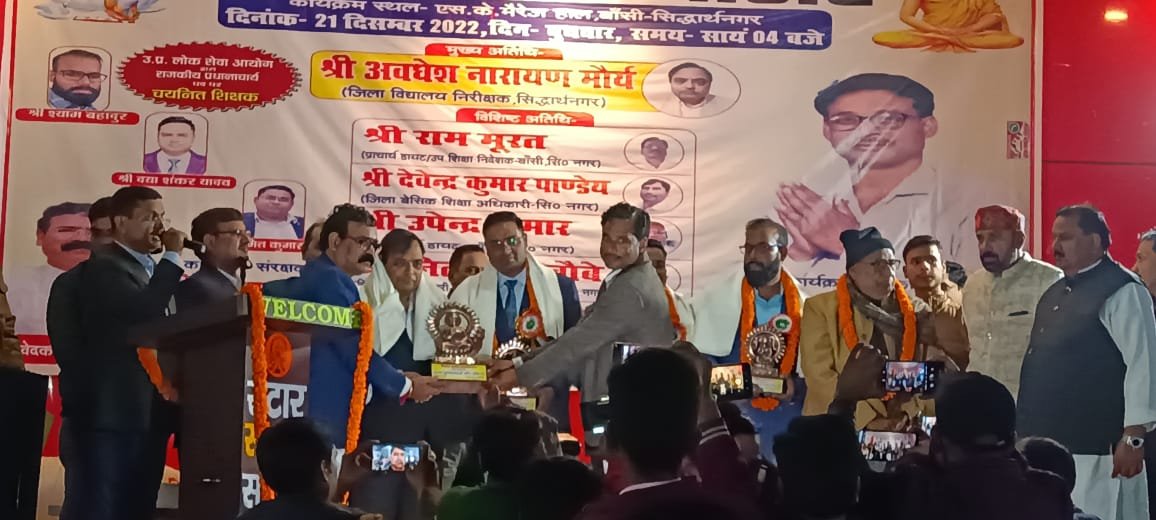 बांसी।पीसीएस 2021 की परीक्षा में राजकीय इंटर कॉलेज में प्रधानाचार्य के पद पर चयनित सिद्धार्थनगर जनपद के तीन होनहार शिक्षकों को सम्मानित करने के लिए बांसी स्थित एसके मैरिज हाल में एक सम्मान समारोह का आयोजन किया गया इस सम्मान समारोह के संयोजक विजय बहादुर अंबेडकर जी पेशे से एक शिक्षक हैं जो लगातार समाज सेवा का कार्य भी करते रहे हैं समाज सेवा में सदैव तत्पर रहने वाले विजय बहादुर अंबेडकर जी ने इस सम्मान समारोह में वृहद स्तर पर आयोजन किया।कार्यक्रम के संरक्षक यू पी एजुकेशन मिनिस्ट्रियल एशोसियेशन के प्रदेश उपाध्यक्ष ओंकार नाथ जी इस सम्मान समरोह में महत्त्वपूर्ण भूमिका का निर्वहन किया। जिले के सैकड़ों शिक्षकों व कर्मचारियों की उपस्थिति में जिले के तीन होनहार शिक्षक जिन्होंने पीसीएस 2021 की परीक्षा में चयनित होकर अपने विद्यालय साथ ही जिले का नाम रोशन किया है को सम्मानित करते हुए कहा कि यह अत्यंत गौरव की बात है, इन तीन होनहार शिक्षकों में अमित कुमार सिंह तिलक इंटर कॉलेज बांसी में सहायक अध्यापक के पद पर कार्यरत हैं। दया शंकर यादव जनता विद्या मंदिर इंटर कॉलेज उदयराज गंज में सहायक अध्यापक के पद पर कार्यरत हैं और श्याम बहादुर जी केंद्रीय विद्यालय सिद्धार्थ नगर में कार्यरत है। इस सम्मान समारोह में मुख्य अतिथि श्रीमान जिला विद्यालय निरीक्षक सिद्धार्थनगर विशिष्ट अतिथि डायट प्राचार्य बांसी सिद्धार्थनगर रहे, साथ ही वित्त एवं लेखाधिकारी सिद्धार्थ नगर इटवा के विधायक माता प्रसाद पांडे जी, राज्य कर्मचारी परिषद के पदाधिकारी गण माध्यमिक शिक्षक संघ के जिला अध्यक्ष एवं जिला मंत्री, प्राथमिक शिक्षक संघ के तमाम सारे पदाधिकारी गण मौजूद रहे। इस कार्यक्रम को संबोधित करते हुए जिला विद्यालय निरीक्षक सिद्धार्थनगर ने कहा की इन तीन होनहार शिक्षकों ने पीसीएस की परीक्षा में चयनित होकर जिले का नाम रोशन किया है और लोगों को ऐसी उच्च परीक्षाओं में चयनित होने के लिए प्रेरणा देने का भी कार्य किया है उन्होंने इस कार्यक्रम की सराहना करते हुए कहा की ऐसे होनहारों के लिए सम्मान समारोह का मनाया जाना अत्यंत गौरव की बात है। संबोधित करने वालों में एस के मैरिज हाल के मालिक श्री शमीम खान साहब ने कहा की समाज में मां-बाप के बाद अगर किसी का सबसे ऊंचा दर्जा होता है तो वह अध्यापक का ही होता है उन्होंने कहा कि बच्चे के अंदर संस्कार और शिक्षा देने के कार्य में सबसे बड़ी भूमिका मां-बाप के अतिरिक्त एक शिक्षक की ही होती है। इस सम्मान समारोह के कार्यक्रम को इटवा के विधायक माता प्रसाद पांडे ने भी संबोधित किया। कार्यक्रम का संचालन प्रधानाचार्य महामना मालवीय इंटर कॉलेज बरगदवा शैलेंद्र शर्मा ने किया। कार्यक्रम के आयोज