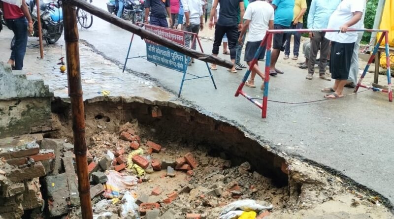 बांसी – लगातार हो रही मूसलाधार बारिश से नगर पालिका से मंगल बाजार जाने वाली सड़क धंसी